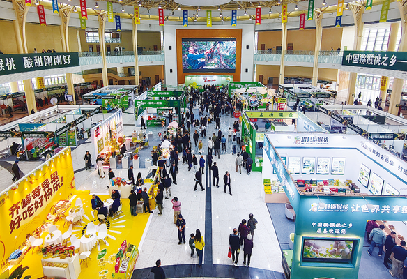 博览会展馆内,琳琅满目的猕猴桃产品吸引了众多客商参观洽谈